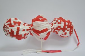 Das Motiv des Doppelgängers bzw. auch das des Januskopfes bekommt im Zeitalter der Künstlichen Intelligenz eine neue Dimension: Nun ist es nicht mehr das eigene Ich, das in psychischer Spaltung Zwiesprache hält oder dem Gegenüber seine Doppelgesichtigkeit zeigt, sondern es gibt nur noch das eine eigene Gesicht, das in vermeintlich ständiger Selbstspiegelung schon lange seine Profilbildung an die Algorithmen abgegeben hat. Die doppelköpfige Skulptur „Sei Dein Gott“ spielt mit diesem Vexierspiel: Zwei Normköpfe, gewebt aus Flatterband, sind in der Waagerechten angeordnet und um 180 Grad gegeneinander gedreht. Zwischen ihnen ist das Flatterband in einem lockeren Knäuel in Auflösung begriffen; und auch am rechten Kopf hängt ein Flatterbandende herunter und erweckt den Eindruck, dass man damit das gesamte Skulpturgewebe auftrennen könnte. Die Dialog- und Korrektivfunktion des Doppelgesichts geht verloren, es bleibt ein Selbstnormierungswahn, der bereits komplett digital gesteuert wird. (Stefanie Lieb)