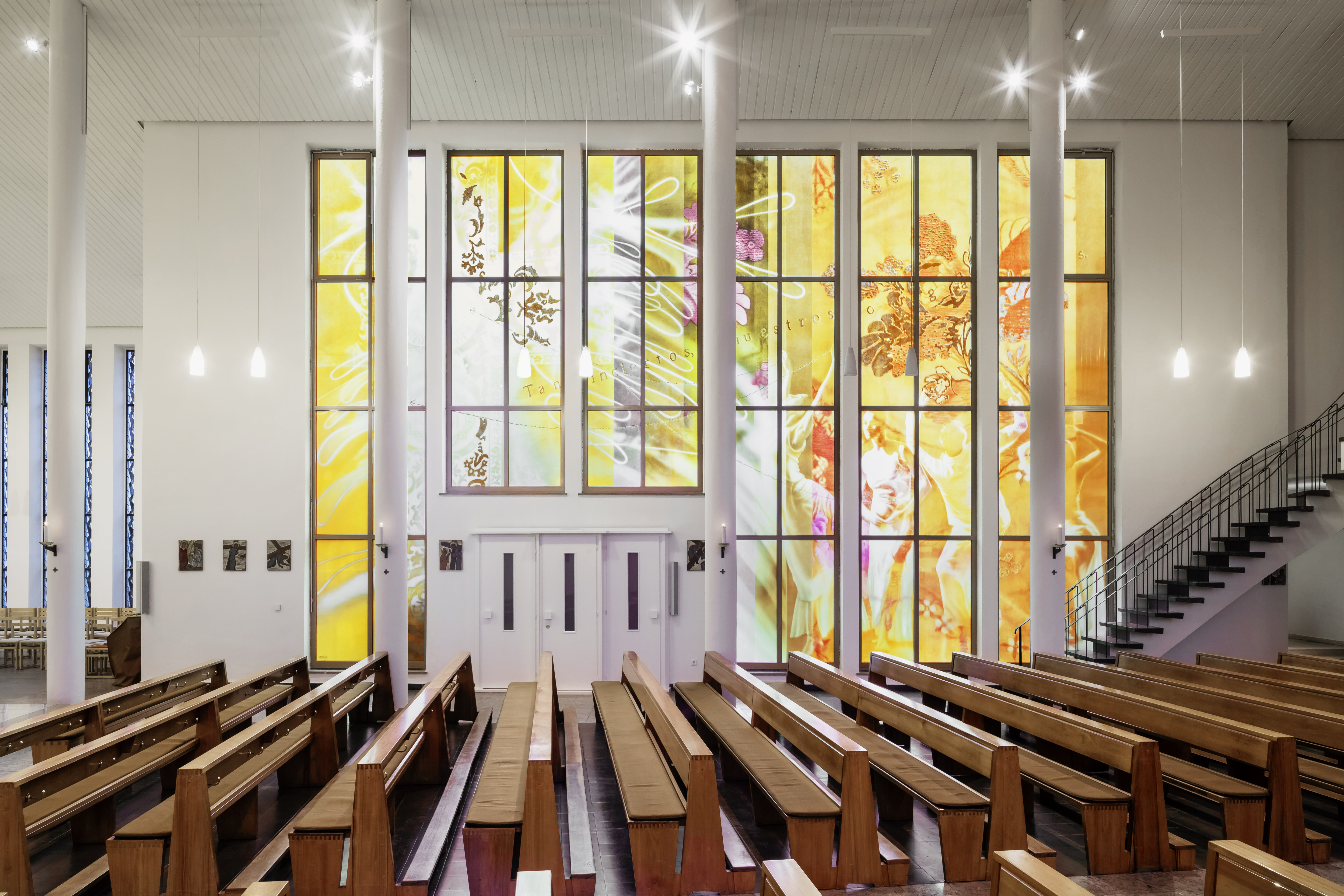 Für die Nachkriegskirche St. Bernward im niedersächsischen Ilsede stand 2018 im Rahmen der Renovierung die Auswechslung der zwei beschädigten und ungedämmten großen Originalfenster auf der Nord- und Südseite an. Die Gemeinde und das Bistum entschieden sich für die Entfernung der dunklen Betonmaßwerkfenster und für den Einsatz neuer Fenster nach dem Entwurf von Lilian Moreno Sánchez. Die Künstlerin, die hier erstmalig mit dem Material Glas arbeitete, konnte ihre textilen Entwürfe von „Tod“ (violett) und „Auferstehung“ (gelb) in Zusammenarbeit mit Glasstudio Peters aus Paderborn in großformatigen und intensiv leuchtenden Glasgemälden umsetzen. Es finden sich hier christliche Motive von Leid und Schmerz, aber auch von Tanz, Lebensfreude und Mitgefühl. Pfarrer Thomas Mogge fasste die neu entstandene Lichtmagie des Kirchenraumes folgendermaßen zusammen: „Der Mensch mittendrin zwischen Tod und Auferstehung, beides hat seinen Platz im Raum des Betens und Singens.“ (Stefanie Lieb)